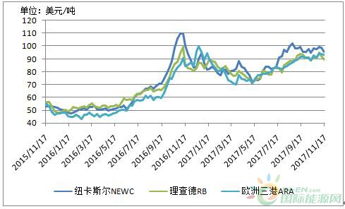截至2017年11月17日当周,澳大利亚纽卡斯尔港动力煤价格报收95.21美元/吨,环比下跌3.45美元/吨,跌幅3.5%;南非理查德港动力煤价格指数报收89.16美元/吨,环比下跌3.13美元/吨,跌幅为3.4%;欧洲ARA三港市场动力煤价格指数报收93.43美元/吨,环比下跌0.64美元/吨,跌幅为0.68%。