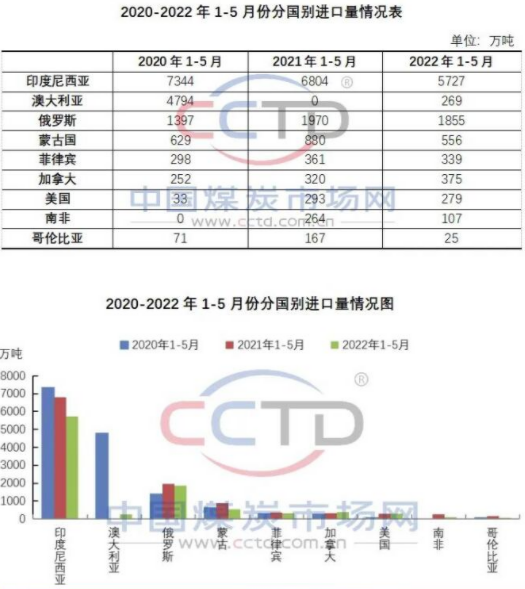 2022年1-5月份,除了从加拿大进口煤炭数量同比增加外,我国从印尼、俄罗斯、蒙古国、菲律宾、美国、南非和哥伦比亚的进口煤数量同比均出现减少,尤其是从南非和哥伦比亚进口煤数量减少较为明显,同比降幅分别为59%和85%。需要说明的是,澳洲煤的进口量是此前滞留在港的货物得以通关,并不是在今年进口的量。