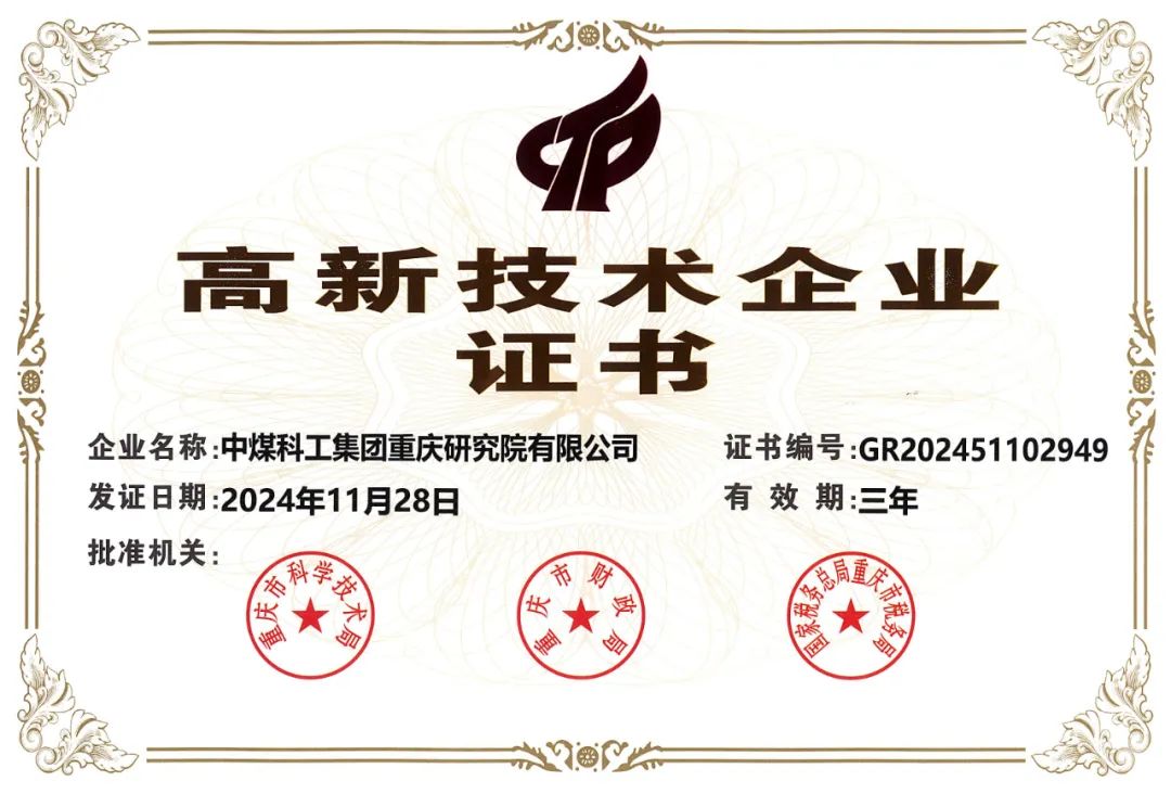 近日,中国煤科重庆研究院获得高新技术企业称号,这一荣誉标志着企业在煤矿安全科技领域的创新能力得到国家认可,进一步巩固了行业领先地位。