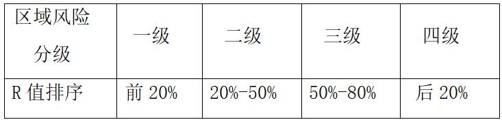 根据风险分级模型计算出所评价的每个区域的风险值,将各区域按照风险值从高到低进行排序,排名位于前20%的区域为一级风险区域,排名位于20%-50%的区域为二级风险区域,排名位于50%-80%的区域为三级风险区域,排名位于后20%的区域为四级风险区域,遵循“帕累托”法则,如下表。