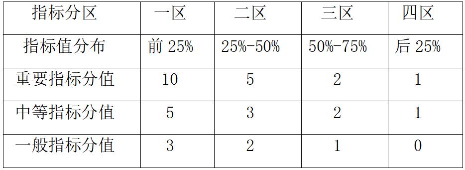 基于帕累托法则(即在任何一组东西中,最重要的只占小部分,约20%,其余80%尽管是多数,却是次要的),对指标取值进行合理分区取值,最终达到指标分级的目的。具体实现过程为:将各区域单一指标的实际数据按照从高到低进行排序,将取值范围平均分为四个区间,前25%为一区,25%-50%为二区,50%-75%为三区,后25%为四区。不同权重指标各区得分不同,详细内容如下表所示。