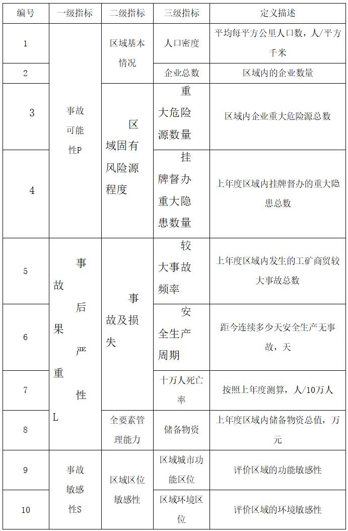 事故发生可能性p包含区域基本情况、区域固有风险源程度等二级指标;风险事件后果严重度l包含事故及损失指标、全要素管理能力等二级指标;风险事件敏感性s包含社会敏感性、区位敏感性等二级指标,部分指标如下表所示。