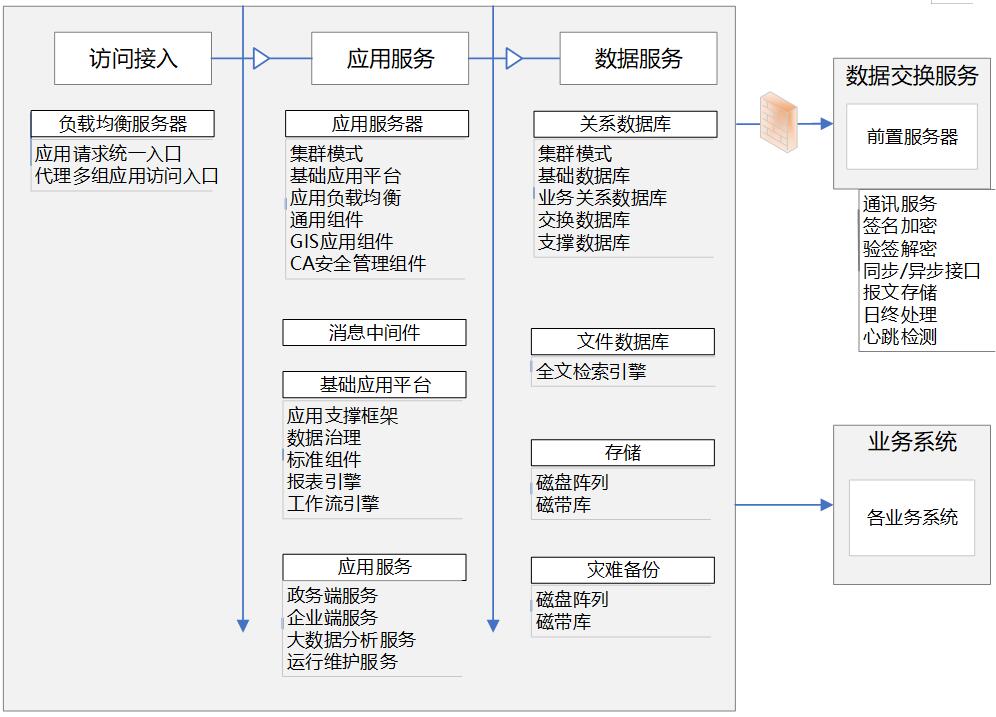 采用开放技术标准,通过通用功能组件和特定功能组件,以及根据业务需求对组件进行相应配置或二次开发,提供通用应用基础支撑、移动应用支撑、门户集成、工作流引擎、自动化报表引擎、身份认证、访问控制、授权管理、地理信息、内容管理、数据处理等服务,为应用层系统开发提供支撑。