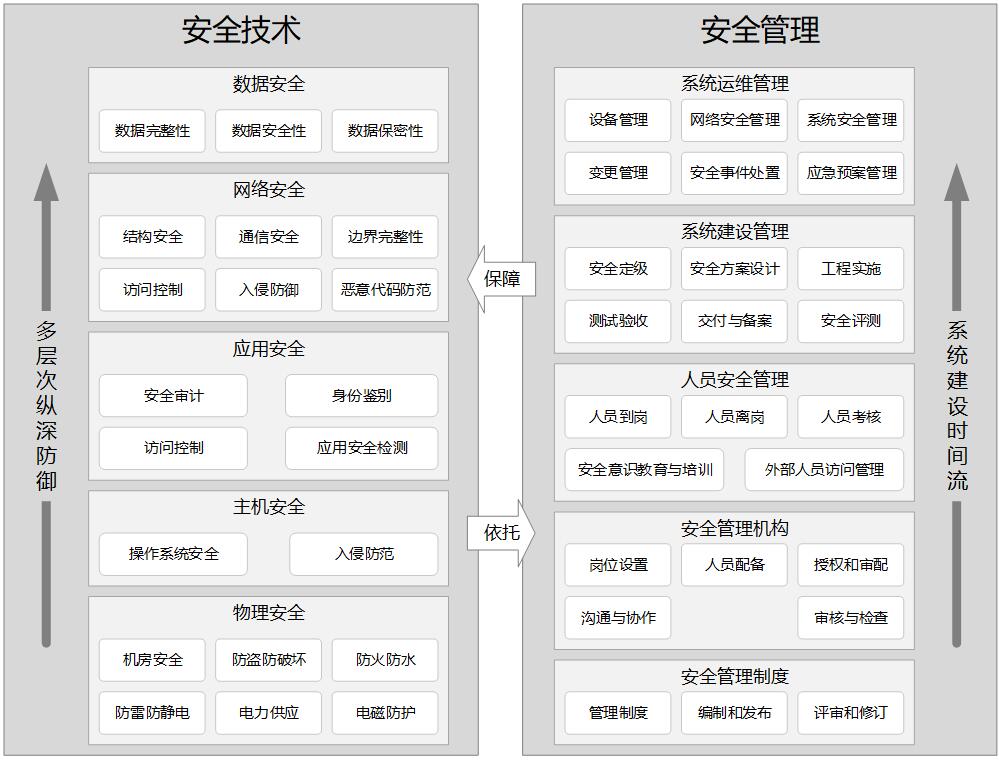 技术类安全要求与信息系统提供的技术安全机制有关,主要通过在信息系统中部署软硬件并正确的配置其安全功能来实现;管理类安全要求与信息系统中各种角色参与的活动有关,主要通过控制各种角色的活动,从政策、制度、规范、流程以及记录等方面做出规定来实现。基本技术要求从物理安全、网络安全、主机安全、应用安全和数据安全几个层面提出;基本管理要求从安全管理制度、安全管理机构、人员安全管理、系统建设管理和系统运行维护管理几个方面提出,基本技术要求和基本管理要求是确保信息系统安全不可分割的两个部分。
