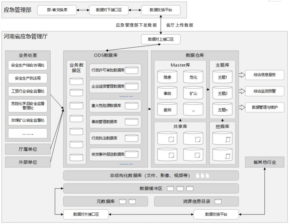 总体数据架构的数据存储主要由ODS区、数据仓库区、数据缓冲区(交换数据临时存储区)、非结构化数据存储区、元数据及资源信息目录等区域构成: