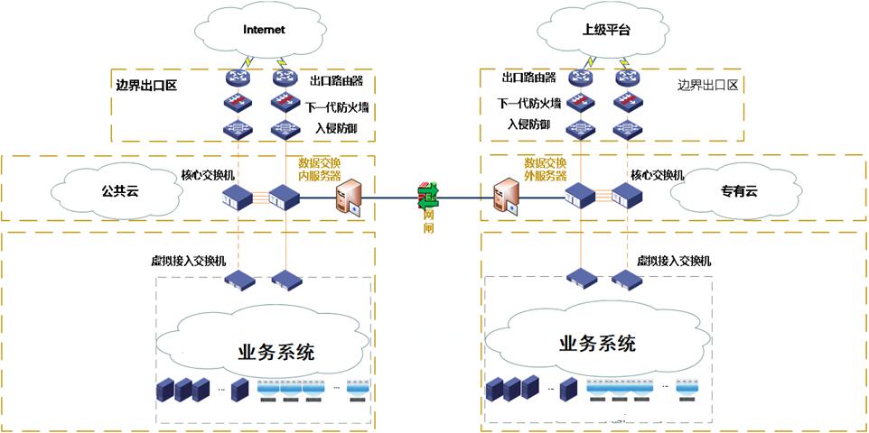 本项目依托于政务云平台进行建设,各应用系统根据需求部署在政务专有云和公共云。来自互联网侧的访问通过电子政务外网互联网区访问公共云,并通过网闸进行跨域数据交互。