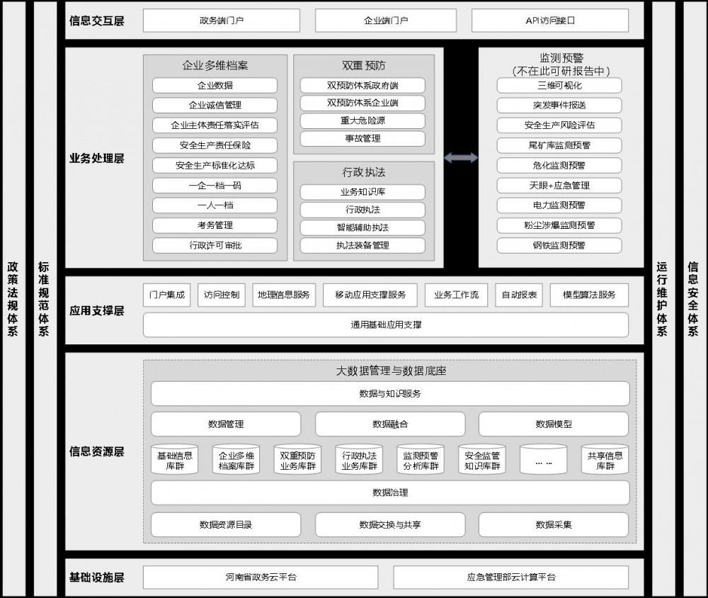 应用系统是支撑业务工作的核心,在现有应用框架上进行功能升级和完善,包括三大部分,即以企业多维档案为主线的协同监管类系统、为双重预防提供支撑的政务端和企业端服务系统,为行政专业提供支撑的智能辅助专业的业务知识库和行政专业系统。业务处理层还将为监测预警提供接口和数据支撑。