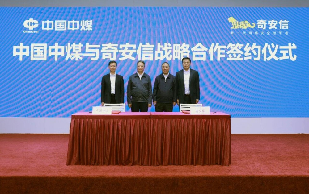 10月9日,中国中煤奇安信集团在京签署战略合作协议。中国中煤党委书记、董事长王树东与奇安信集团党委书记、董事长齐向东举行工作会谈并见证签约。中国中煤党委常委、副总经理倪嘉宇,奇安信集团高级副总裁吴登峰分别代表双方签署协议。奇安信集团副总裁唐皓参加活动。