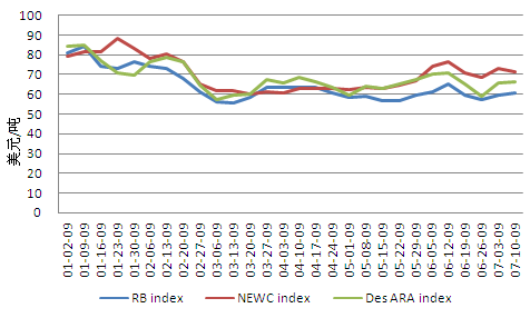 图表1 2009年上半年环球煤炭平台三大国际煤价走势