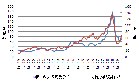从对1999年1月至2009年6月国际油价和国际煤价数据的相关性分析结果来看,两者相关系数为0.89。这也在统计上证明,长期趋势下国际油价与国际煤价具有很强的相关性。