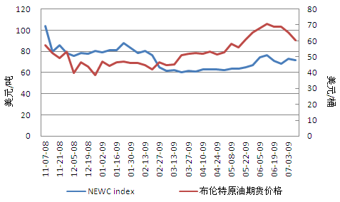 从2008年11月以来NEWC index和布伦特原油期货价格走势来看,前者经过将近4个月的震荡调整之后,于今年2月底再次经历了短暂暴跌,然后继续震荡调整,直至5月底,才再次出现短暂小幅上行,随后继续震荡调整;后者在2008年11、12月经过短暂震荡下行之后,开始了持续震荡上行,5月中下旬上升幅度突然加大,随后又与6月中下旬开始回调。
