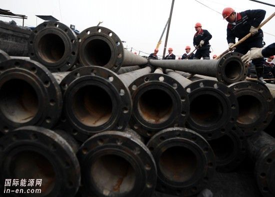 3月31日,抢险救援人员在搬运粗口径的排水管。